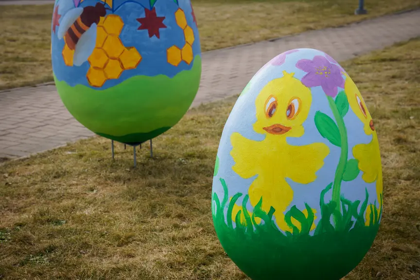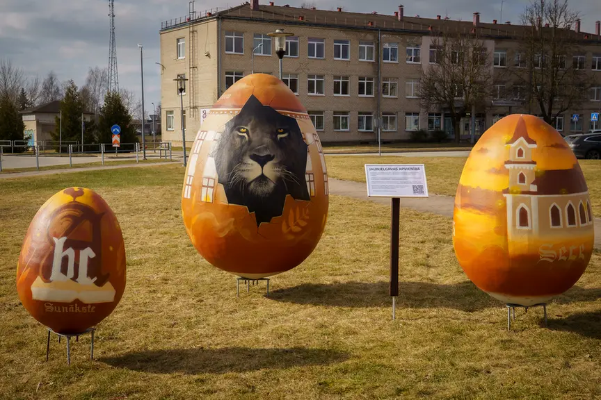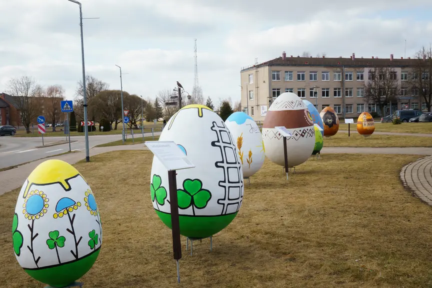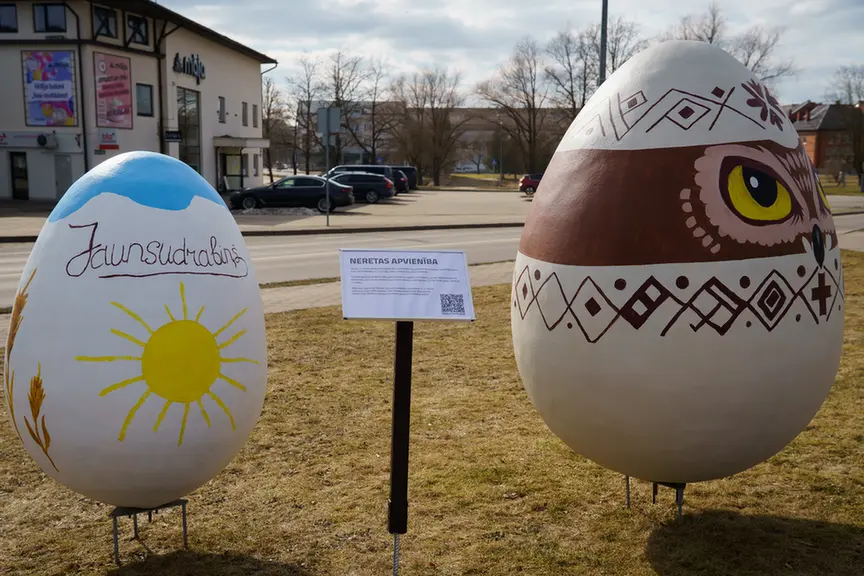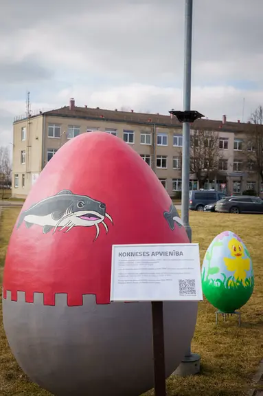 Aizkraukles centrālajā laukumā izvietotas 12 dažāda lieluma Lieldienu olas, uz kurām krāšņus rakstus un zīmējumus veidojuši gan jaunie, gan profesionālie mākslinieki no visa novada.