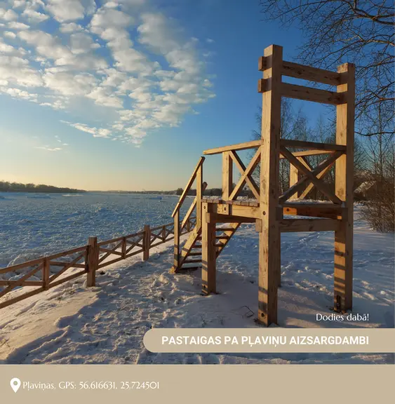Dambis, kas pasargā pilsētu no pavasara paliem, vienlaikus piedāvā plašu skatu uz Daugavu un apkārtējo ainavu. Īpaši skaisti mirkļi piedzīvojami saulrietā, kad debesis iekrāsojas siltos toņos. Pastaigu iespējams iemūžināt pie foto rāmja “Mirklis pie Daugavas”, bet papildu izziņai - noklausīties audiogidu par plostnieku taku - https://ej.uz/Pļaviņu_plostnieku_taka