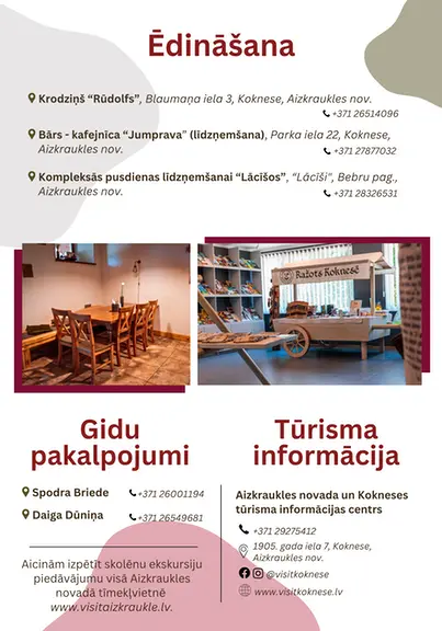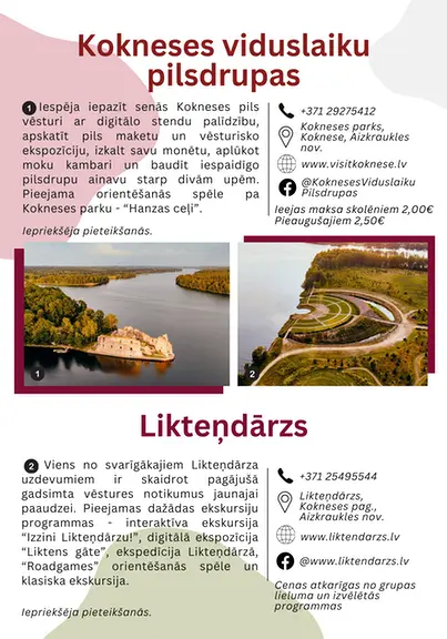 Lai klases ekskursijas plānošana nesagādātu galvassāpes, Aizkraukles novada un Kokneses tūrisma informācijas centrs ir sagatavojis klases ekskursiju ceļvedi Kokneses apkārtnē. Kur doties un ko darīt? Ielūkojies sagatavotajā apkopojumā un ieplāno aizraujošu ekskursiju Kokneses apkārtnē!