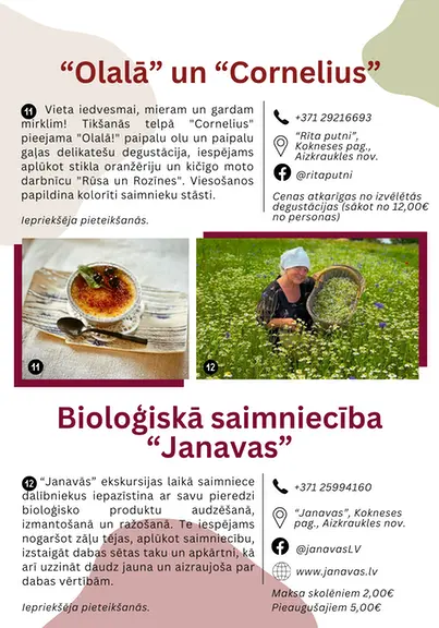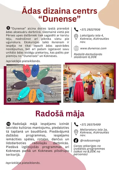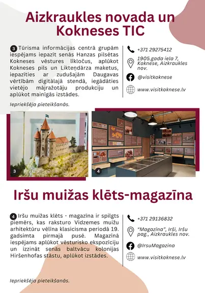 Idejas pusdienošanai, naktsmītnēm un citiem aizraujošiem galamērķiem plašajā Aizkraukles novadā un Koknesē meklē mājaslapās www.visitkoknese.lv un www.visitaizkraukle.lv.