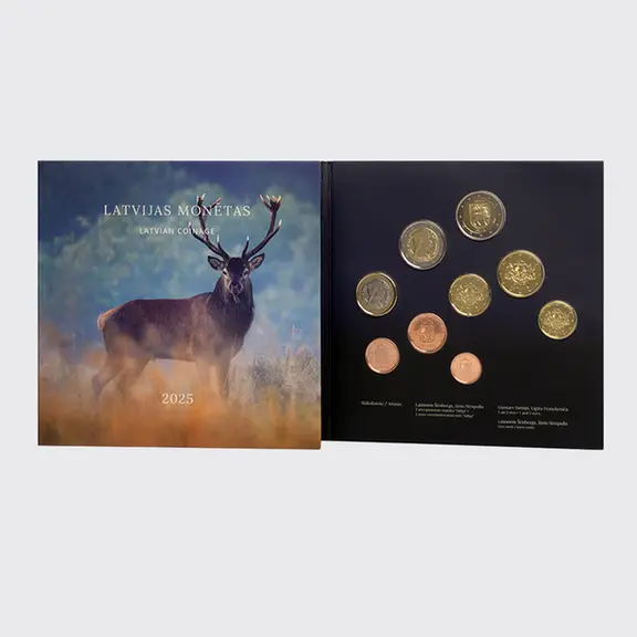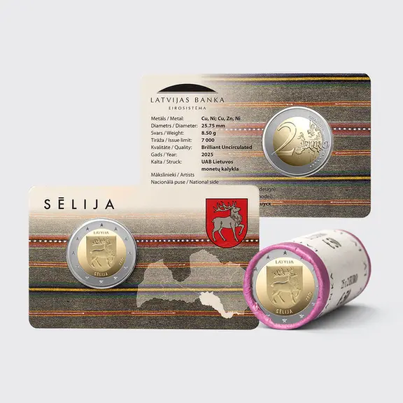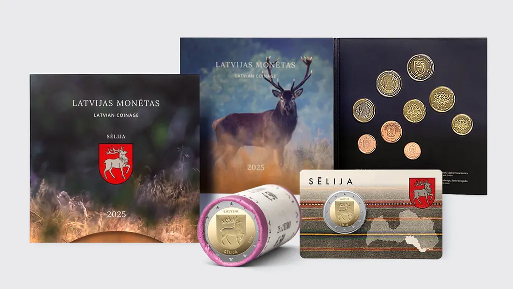 • Apgrozības monētu komplektā “Sēlija” (Brilliant Uncirculated kvalitātē) – 6000 eksemplāru, ietver visas 2025. gada eiro monētas (no 1 centa līdz 2 euro) un jauno piemiņas monētu, cena 33 €.