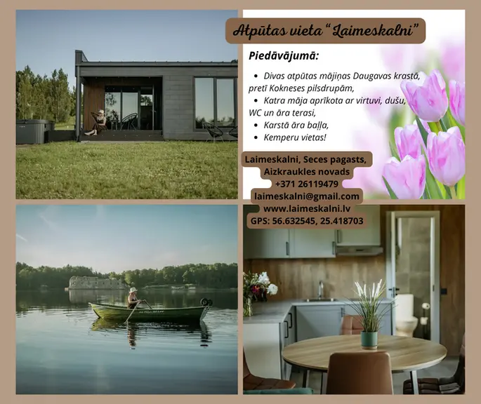 - Atpūtas vieta “Laimeskalni” – aicina uz brīdi apstāties un baudīt pavasara saules pielietās dienas Daugavas krastos ar skatu uz Kokneses pilsdrupām! Piedāvājumā divas mājīgas atpūtas mājiņas. Katrā mājiņā ir arī aprīkota virtuve, vannas istaba ar dušu un WC, kā arī terase. Pieejama baļļa (par papildu samaksu).
