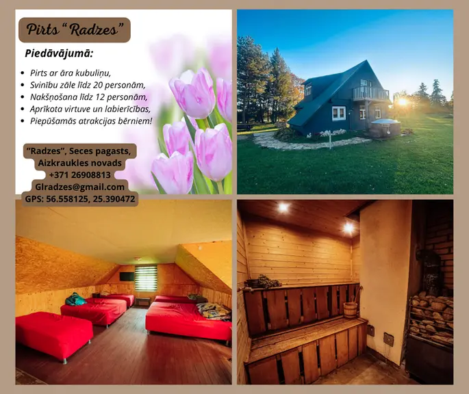 - Pirts “Radzes” – sasildīs gan pirtī, gan āra kubuliņā. Piedāvājumā arī svinību zāle 20 personām, ar nakšņošanas iespējām 12 personām. Padari viesošanos jautrāku, jo iespējams izīrēt arī piepūšamās atrakcijas bērniem!