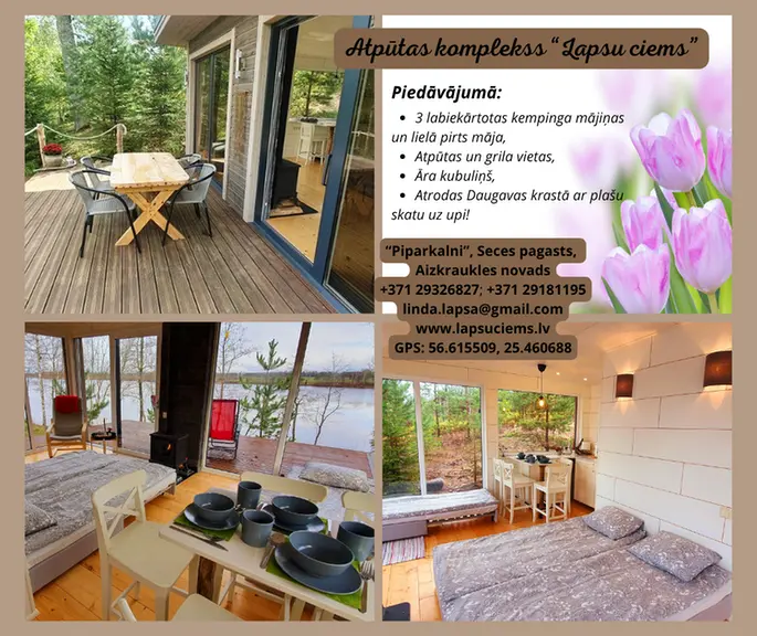- Atpūtas komplekss “Lapsu ciems” – piedāvājumā 3 kempinga mājiņas, pirtsmāja, volejbola laukums, atpūtas un grila vietas. Mājiņas atrodas Daugavas krastā, ar plašu skatu uz upi un maksimālu dabas tuvumu, tajā pašā laikā saglabājot komfortu un ērtības! Lieliska vieta romantiskai divvientulībai vai nesteidzīgai kopā būšanai plašākā draugu lokā.