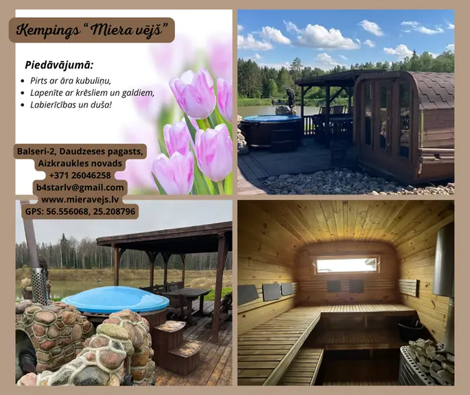- Kempings “Miera vējš” – šeit iespējams aizbēgt no ikdienas kņadas un izkarsēties pirtī vai āra kubulā. Pieejama arī nojume ar krēsliem un galdu, kā arī labierīcības un duša.