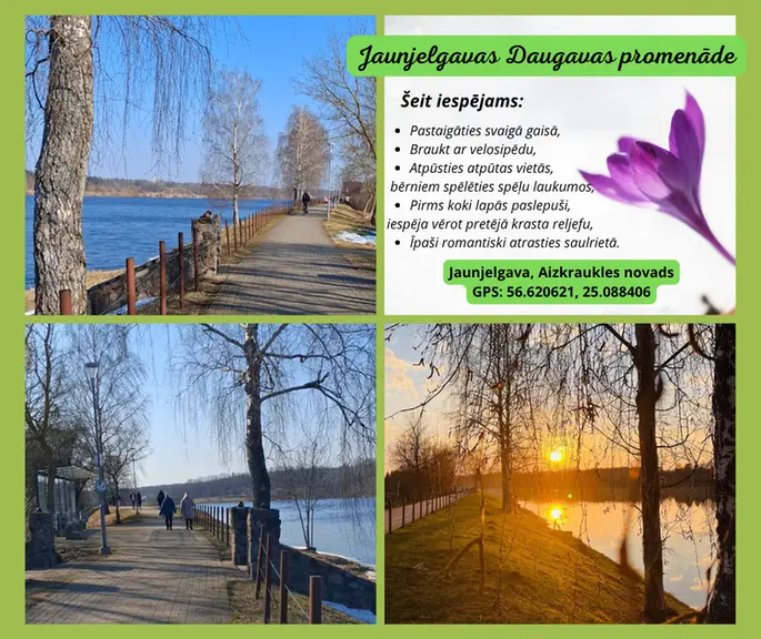 - Jaunjelgavas Daugavas promenāde – promenāde gar Daugavu aicina izbaudīt pastaigas un vērot upes rāmo tecējumu. Ja gribas ko aktīvāku, pastaigas vietā iespējams izvēlēties velo vai skrituļslidu braucienu. Pieejamas arī atpūtas vietas un bērnu spēļu laukumiņi.
