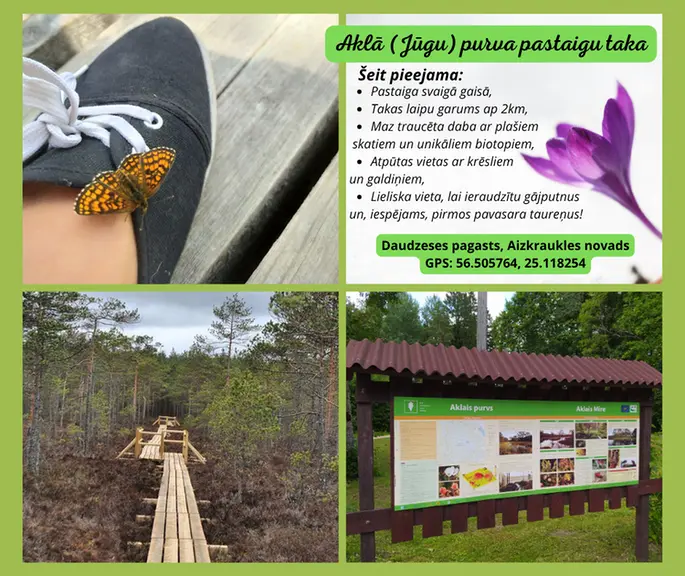 - Aklā (Jūgu) purva taka – Viena no izcilākajām pastaigu vietām Jaunjelgavas apvienībā. Šeit augstā purva ainava izceļas ar maz traucētu dabu, plašiem skatiem un unikāliem biotopiem. Takas koka laipas ved ceļotājus aptuveni 2 km garā purva pastaigā līdz ezeriņam, kur taka veido loku un atgriežas sākumpunktā. Pieejamas atpūtas vietas ar soliem un galdiņu, informatīvie stendi par sastopamajiem augiem, dzīvniekiem, putniem.