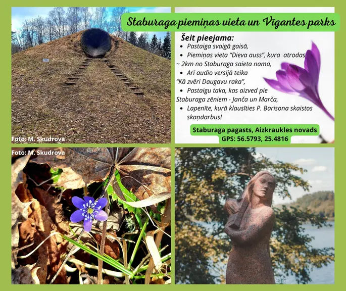 - Staburaga piemiņas vieta un Vīgantes parks – Vīgantes parkā Staburaga bērni Jancis un Marčs gaida ikvienu ciemiņu. Šeit pāri lido ne tikai pavasari skandinošie gājputni, bet arī modušies zvēri no latviešu tautas teikas par Daugavas rakšanu! Skulptūra “Daina” Daugavas krastā klusām vēro ikvienu, bet P. Barisona lapenīte aicina ieklausīties mūzikas skaņās! Turpat netālu piemiņas vieta Staburaga klintij aicina kavēties atmiņās un piemiņas skulptūra “Dieva auss” uzklausīs ikviena sakāmo!