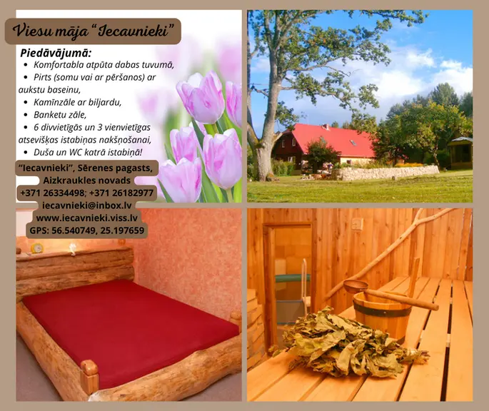 - Viesu māja “Iecavnieki”- piedāvā komfortablu atpūtu dabā, klusā meža ielokā. Piedāvājumā pirti (somu vai ar pēršanos ) ar aukstu baseinu, dušu, WC, kamīnzāli ar biljardu un zāli banketiem, sešas divvietīgas un trīs vienvietīgas atsevišķas istabiņas nakšņošanai, ar dušu un WC katrā istabiņā.