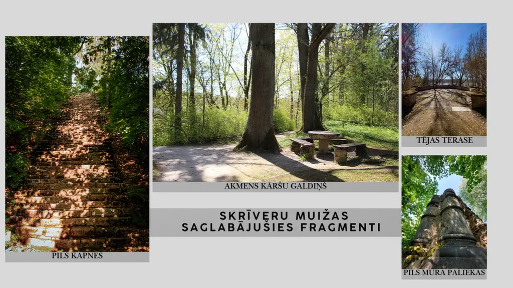 Mūsdienās no Skrīveru apkārtnes muižām un pusmuižām saglabājušās tikai atsevišķas vēsturiskās liecības. Gadsimtu gaitā kari, ugunsgrēki un saimnieciskās pārmaiņas ir ievērojami pārveidojušas šo vietu sākotnējo veidolu. No kādreiz greznās Skrīveru muižas pils līdz mūsdienām saglabājušās vien pils kāpnes, akmens kāršu galdiņš, tējas terase, strūklaka un pils sētas drupas, kas ļauj nojaust tās agrāko izskatu. Citviet muižu teritorijās redzamas vien parku paliekas, pārbūvētas saimniecības ēkas un ainaviski apvidi, kas joprojām piešķir vēsturisko noskaņu.
