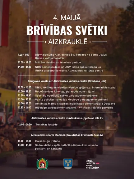 Traffic restrictions are expected during the celebrations, including during the military parade and its rehearsal. Traffic closure schedules and recommended parking areas can be found here: https://ej.uz/satiksmes_ierobežojumi_Aizkrauklē
