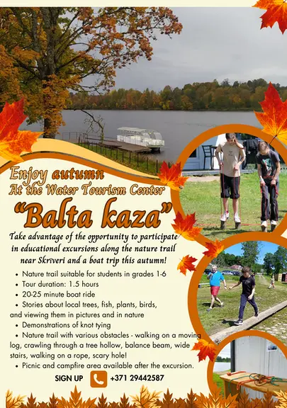 The Water Tourism Center and the Balta Kaza boat in Skrīveri offer educational excursions along a nature trail. These are suitable for children in grades 1-6 and last 1.5 hours. They offer:
