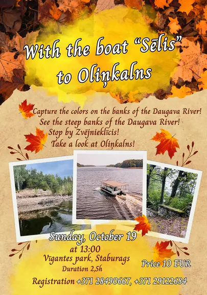 The boat "Sēlis" offers a special end-of-season trip on October 19 at 1:00 p.m. The trip will take you from Vīgantes Park in Staburags Parish to Oliņkalns! The offer includes: