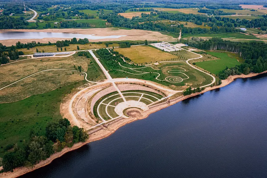 Amfiteātris ir Likteņdārza sirds, kas simboliski nodala dārza pagātnes un nākotnes daļu.