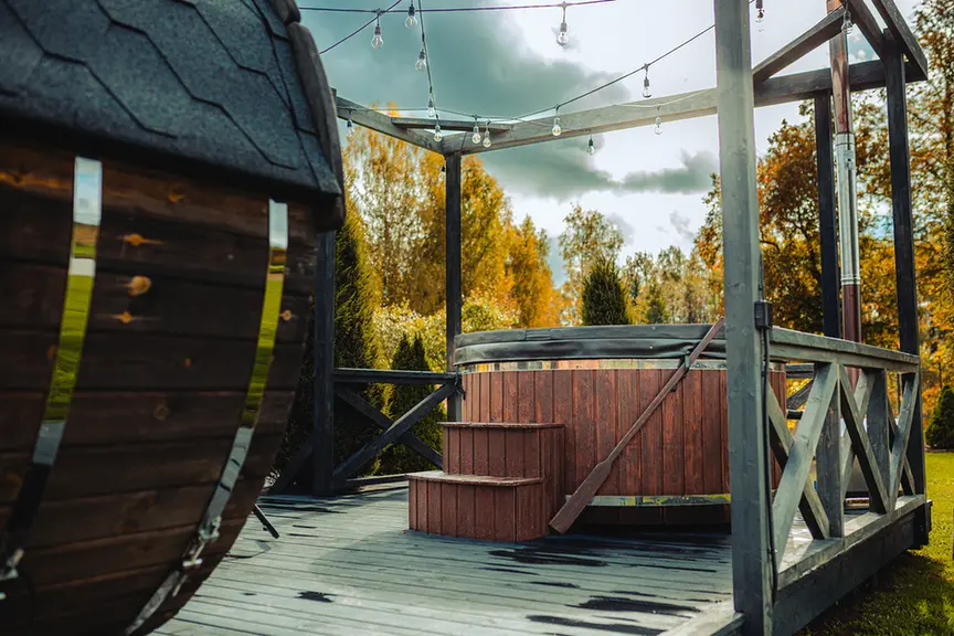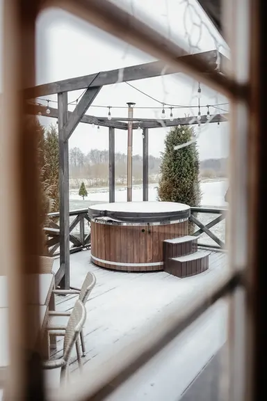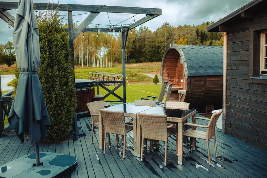 • Liela terase ar kubulu (aprīkots ar hidromasāžu, gaisa burbuļu sistēmu un LED apgaismojumu), mucveida pirti, āra mēbelēm un grilu (ar piederumiem).