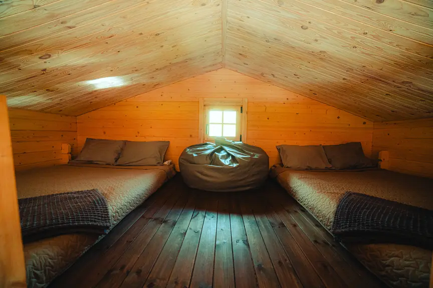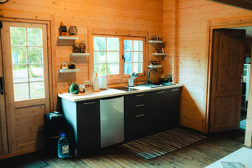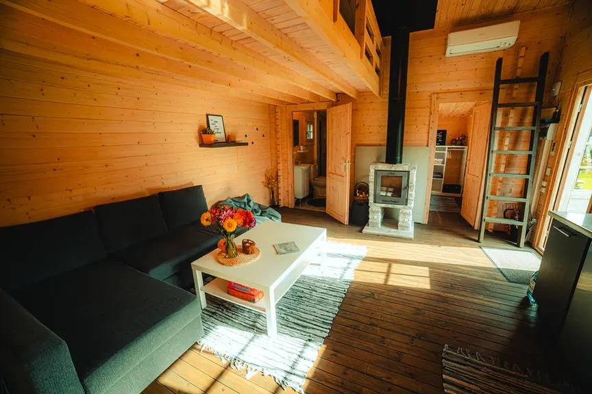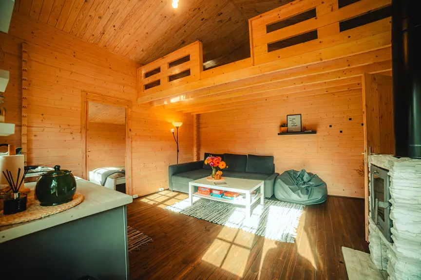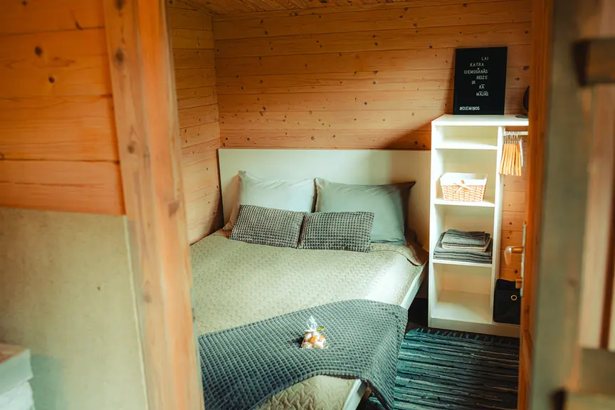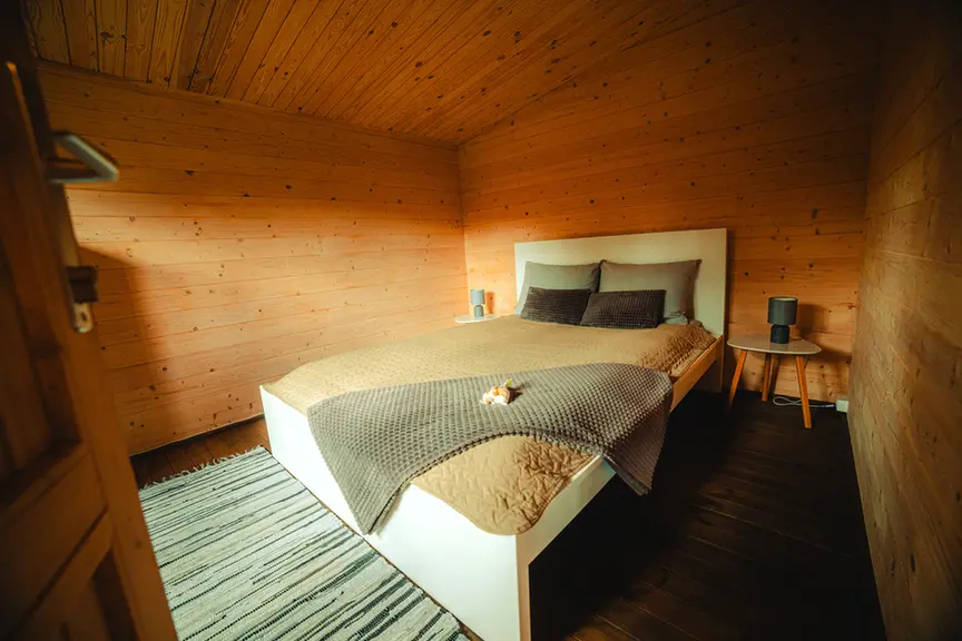 • Namiņš ar divām atsevišķām guļamistabām, dzīvojamā zona apvienota ar virtuvi, kopā pieejamas 5 gultasvietas (divas no tām mansardā). (Kopējā platība 50m2 - ideāli līdz 6-7 cilvēku kompānijai)