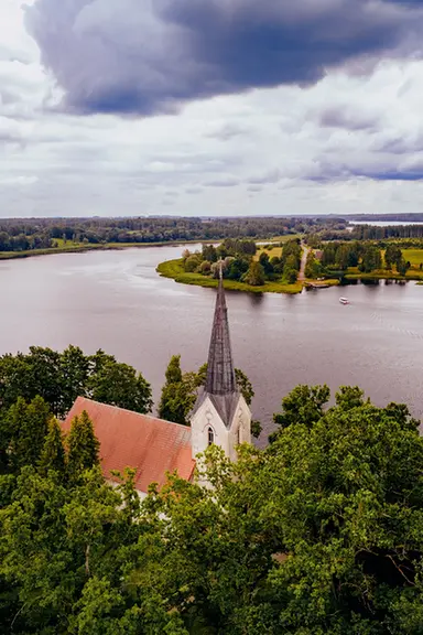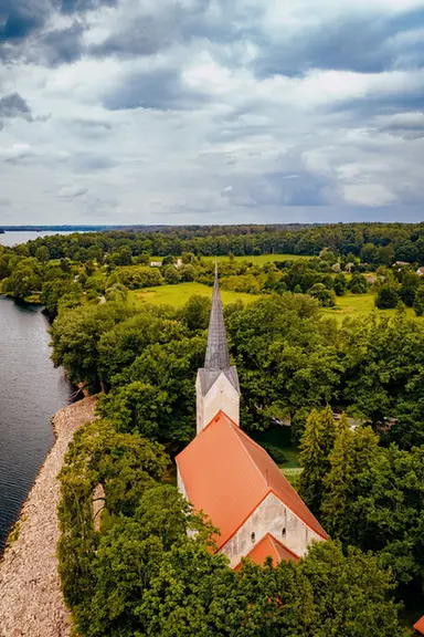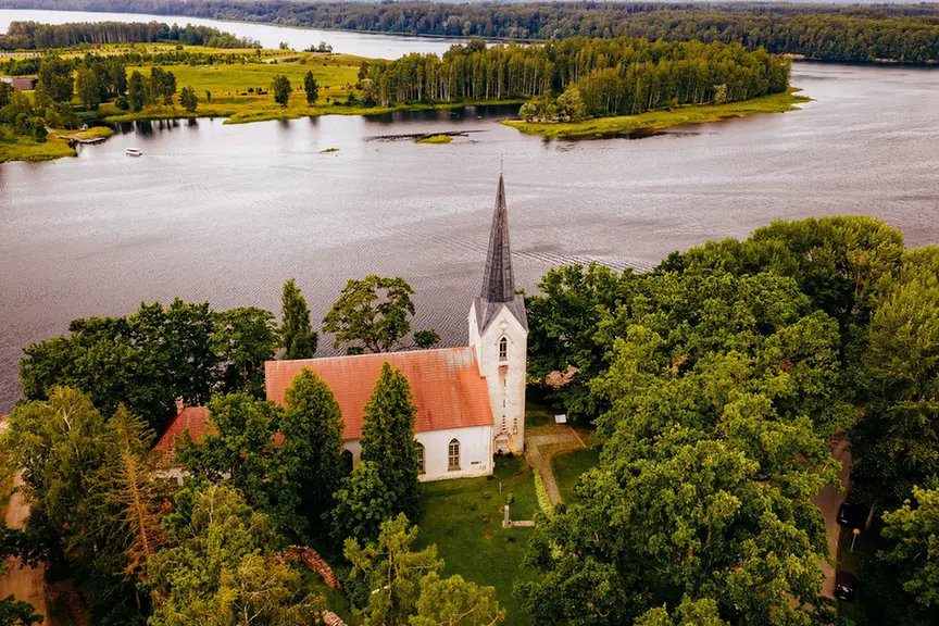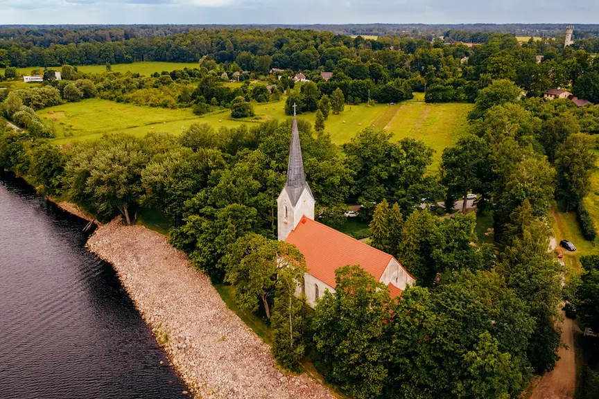 Bažnyčia pastatyta 1687 m. Bokšte kaba didelis ketaus varpas. Interjerą puošia A. Dobenbergo paveikslai. Prie bažnyčios įrengta Lačplėšio Karo ordino kavalierių atminimo stela.