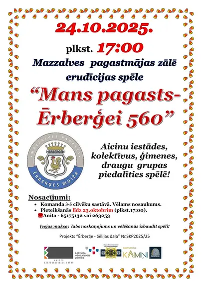 Iestādes, kolektīvi, ģimenes, draugu grupas aicināti piedalīties erudīcijas spēlē. Nosacījumi: komanda 3-5 cilvēku sastāvā, vēlams komandas nosaukums. Pieteikšanās līdz 23.oktobra plkst. 17.00 pie Anitas (65175132). Ieejas maksa - labs noskaņojums un vēlēšanās izbaudīt spēli.