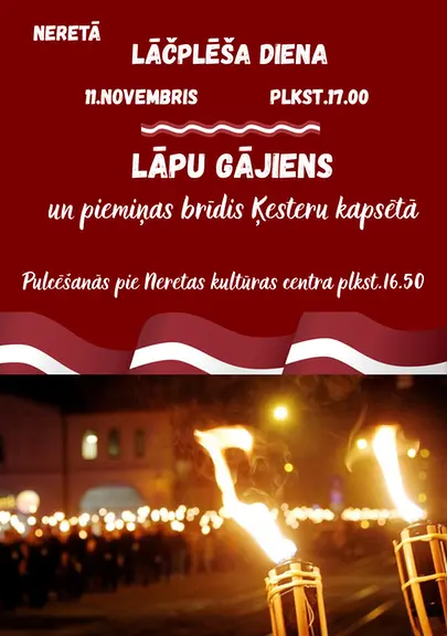 11. novembrī plkst. 17.00, Lāčplēša diena Neretā. Lāpu gājiens un piemiņas brīdis Ķesteru kapsētā. Pulcēšanās pie Neretas kultūras centra 16.50
