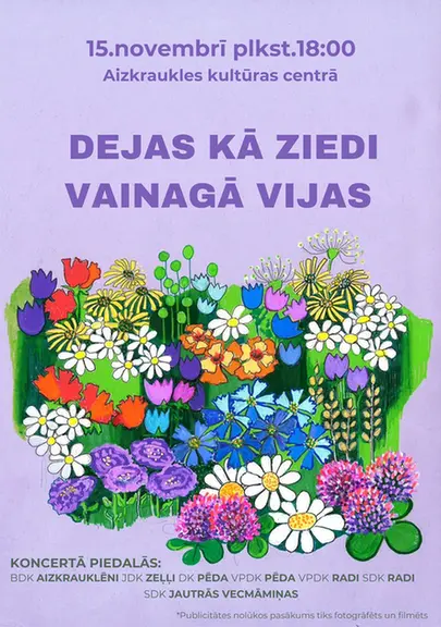 15. novembrī plkst. 18.00, Aizkraukles kultūras centrā, deju kolektīvu koncerts “Dejas kā ziedi vainagā vijas”
