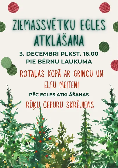 3. decembrī plkst. 16.00, Bebros pie bērnu laukuma, Ziemassvētku egles atklāšana. Rotaļas ar Grinču un Elfu meiteni. Pēc egles atklāšanas – Rūķu cepuru skrējiens.