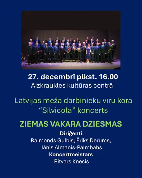 27. decembrī plkst. 16.00, Aizkraukles kultūras centrā, Latvijas meža darbinieku vīru kora “Silvicola” koncerts “Ziemas vakara dziesmas”.