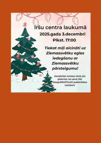 3. decembrī plkst. 17.00, Iršu centra laukumā, tiekat mīļi aicināti uz Ziemassvētku egles iedegšanu ar Ziemassvētku pārsteigumu.