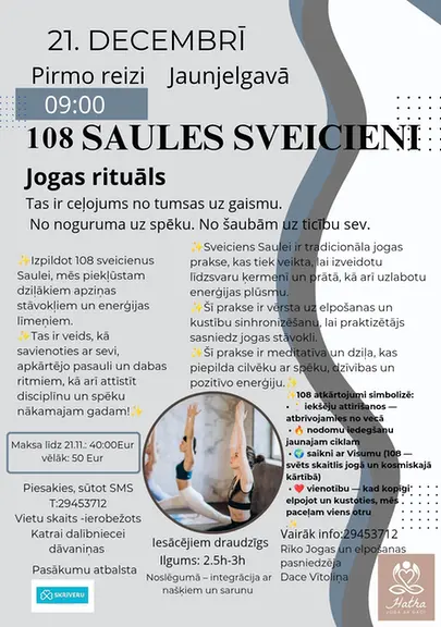 21. decembrī plkst. 9.00, Jaunjelgavā, Jogas rituāls “108 Saules sveicieni”. Rīko Jogas un elpošanas pasniedzēja Dace Vītoliņa. Vietu skaits ierobežots. Pieteikšanās sūtot SMS uz tālruni 29453712.