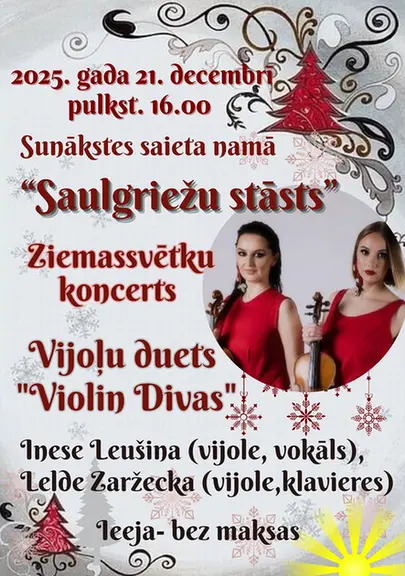 21. decembrī pulksten 16.00, Sunākstes saieta namā – Vijoļu dueta “Violin Divas” Ziemassvētku koncerts “Saulgriežu stāsts”.