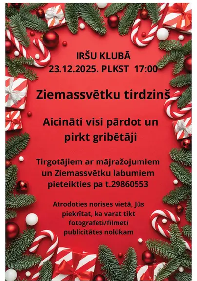 23. decembrī plkst. 17.00, Iršu klubā, Ziemassvētku tirdziņš.