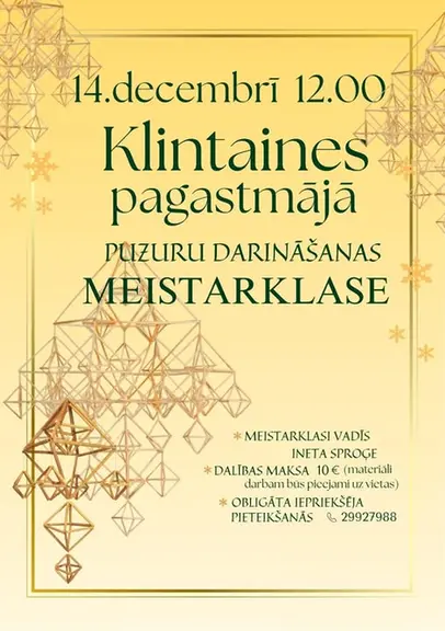 14. decembrī pulksten 12.00 Klintaines pagastmājā – Inetas Sproģes puzuru darināšanas meistarklase. Pieteikšanās pa tālruni 29927988. Dalības maksa – 10 eiro.
